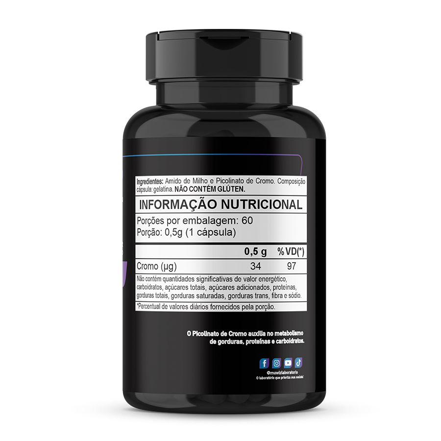 Ingredientes: Amido de milho e Picolinato de cromo. Composição cápsula: gelatina. NÃO CONTÉM GLÚTEN.
