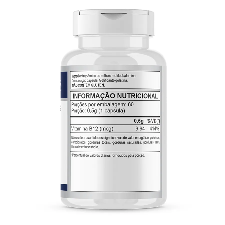 Ingredientes: Amido de milho, cianocobalamina e antiumectante dióxido de silício. Composição cápsula: Gelatina. NÃO CONTÉM GLÚTEN.