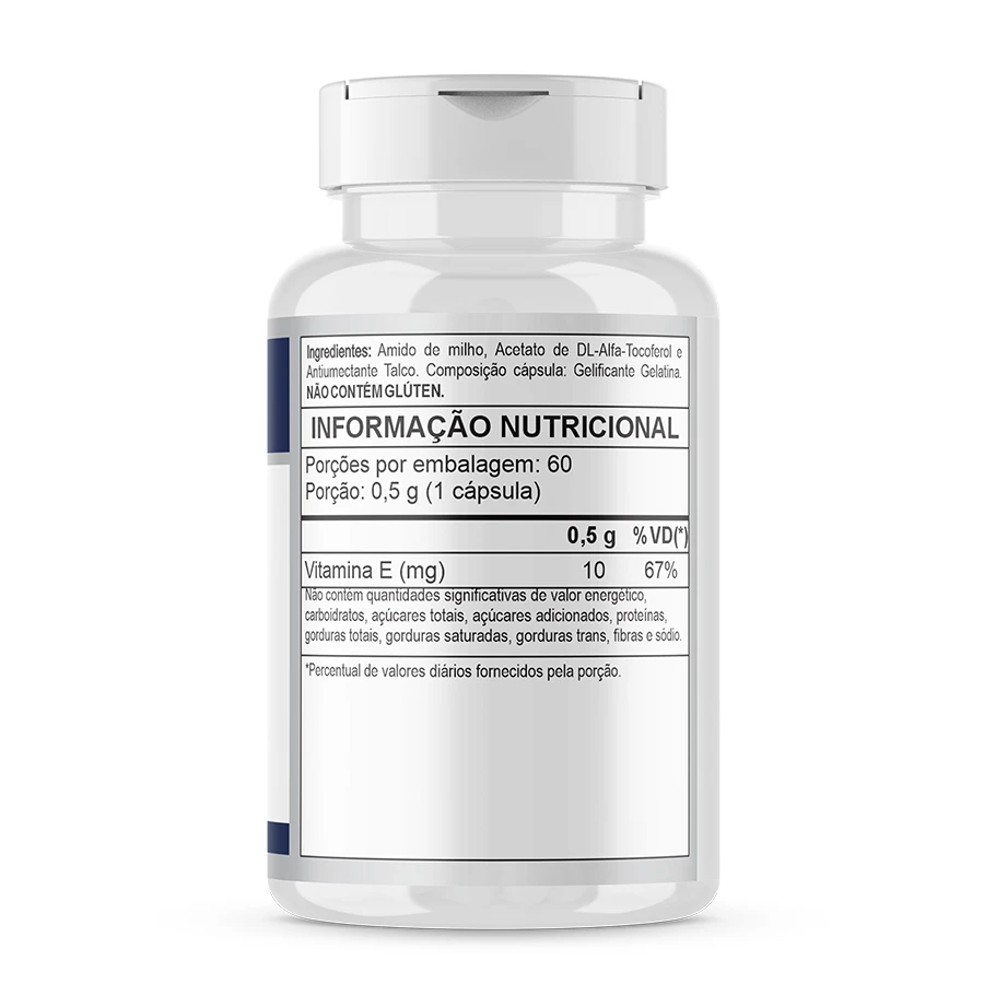 Ingredientes: Amido de milho, Acetato de DL-Alfa-Tocoferol e Antiumectante Talco. Composição cápsula: Gelificante Gelatina. NÃO CONTÉM GLÚTEN.